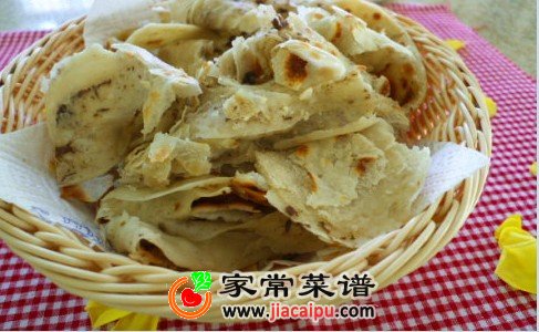 9。将醒好面团擀成直径为15厘米左右的圆饼。烧热平底锅,倒入少许沙拉油,把圆饼放入两面煎至上色,再倒入一汤匙水转小火,盖上锅盖,煎至没有水声即起锅。