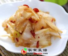 主料:白菜300克 调料:盐3克,醋5克,白砂糖2克,酱油4克,泡椒15克,姜5克,花椒3克 制作方法; 1。将白菜去叶取白菜心洗净,切成长丝,用沸水烫一下,加精盐拌匀腌渍2小时,再挤...