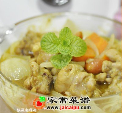 材料:鸡腿、胡萝卜、圆葱、咖喱 做法: 1、胡萝卜、洋葱洗净切块备用; 2、鸡腿去骨切块,清水泡去血水; 3、用少量开水将咖喱块泡化,倒入肉块中腌制一会儿; 4、将胡萝卜块、肉块混合后放入耐热容器中上锅蒸10分钟; 5、开锅放入圆葱块混合,继续蒸5分钟即可。