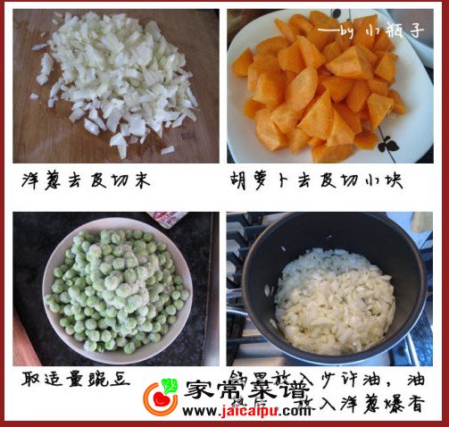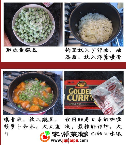 [日式咖喱鸡排饭] 材料:取皮取骨鸡腿肉,洋葱,,胡萝卜,豌豆,日本咖喱块,面粉,面包粉,鸡蛋 佐料:盐,胡椒粉 咖喱制作方法: