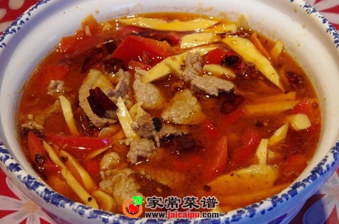 5:放花椒,干辣椒,豆瓣酱,炒出红辣椒的红油为止,放红灯笼椒翻炒三分钟再放酸笋翻炒。