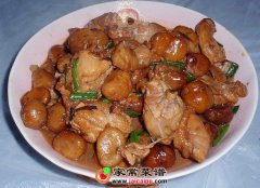 材料:板栗250克、鸡肉200克 调味料:姜25克、葱10克、八角2个、黄酒18克、老抽15克、蚕豆酱25克、白糖10克、味精30克、胡椒粉少许 制作方法: 1、姜切片,葱改段,待用; 2、鸡肉切成...