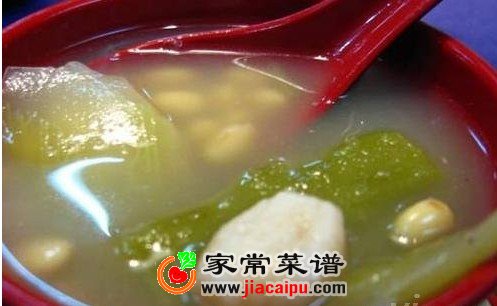 原料:海带丝、绿豆、冬瓜 调料:盐、蘑菇精 制作方法: 1、海带洗净切段;冬瓜连皮洗净后切块;绿豆洗净待用。 2、把所有材料一起放入汤锅中,并加适量水,用中火煮约30分钟后