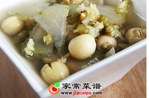 主料: 莲子30克,芡实米30克,薏米50克,桂圆8克调料:蜂蜜30克 制作方法: 1。莲子、芡实米、薏米、桂圆肉加水500克大火煮开; 2。用小火煮1小时; 3。加入蜂蜜即成。 功效: 1。促
