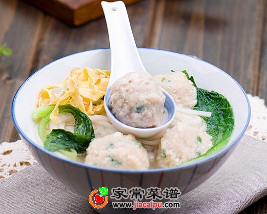 6、煮丸子的汤里,扔一块骨汤的汤料,下入面条,面条出锅前,放入丸子、放一把青菜,1分钟后捞出来,加点鸡蛋皮做装饰,即可。