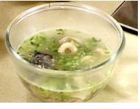 2、坐锅点火放油,油热放入葱、鱼头、鱼骨头翻炒加入料酒、清水、生姜水、盐待锅开倒入青豆、蘑菇、鸡精、香菜末即可出锅。