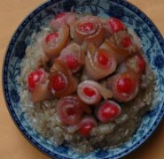 龙眼烧白的材料:肥瘦猪肉、加糖蒸熟的糯米饭、豆沙、红樱桃、菜油、白糖、淀粉、醪糟汁 龙眼烧白的做法: 1、猪肉用水煮熟捞出。 2、炒锅放入油,把猪肉用布擦干水份,加入醪...