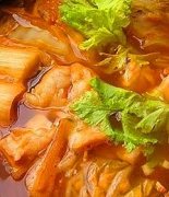 连锅汤的材料:猪后腿肉200克,白萝卜75克(圆白菜、大白菜均可),辣椒油、豆瓣酱、葱各13克,胡椒粉、花椒粉少许,料酒13克,酱油50克,味精3克,花椒5粒,姜8克。 连锅汤的做法:...
