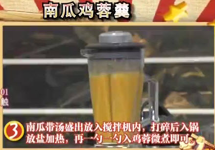 本页提供2013年10月11日深圳卫视娱乐频道食客准备节目笔记,首席厨娘:肥妈。主题是《南瓜鸡蓉羹》。