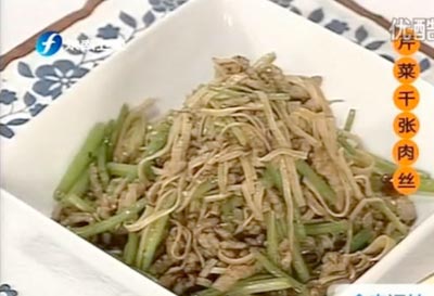 1、芹菜、千张和猪肉切丝,备用。