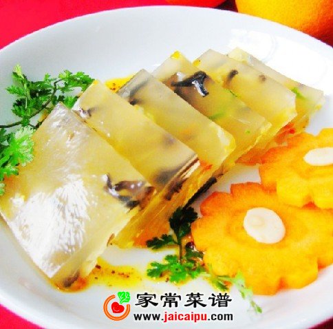 8。火腿、笋片、青椒、水发木耳丝一起倒皮汁稍煮,冷却凝固即可。
