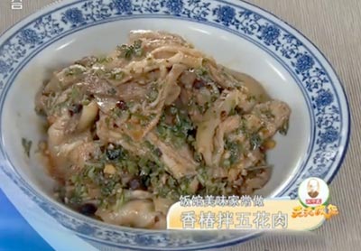 3、煮好的白肉切成薄片,用干辣椒做成辣椒油和碗汁一起倒入白肉中,再放香椿末,拌匀即可。
