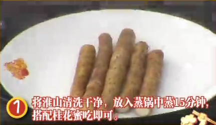 1.将淮山清洗干净,放入蒸锅中蒸15分钟,搭配桂花蜜吃即可。