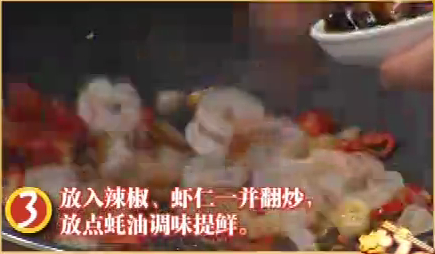 3.放入辣椒、虾仁一并翻炒,放点蚝油调味提鲜。