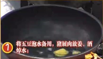 1.将五豆泡水备用,猪展肉放姜、酒焯水。