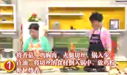 1.将香菇、鸡胸肉、火腿切丝,锅入少许油,将切丝的食材倒入锅中,放鸡粉虾仁炒香。