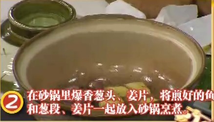 2.在砂锅里爆香葱头、姜片,将煎好的鱼和葱段、姜片一起放入砂锅烹煮。