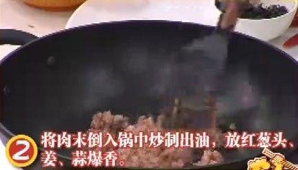2.将肉末倒入锅中炒制出油,放红葱头、姜、蒜爆香。